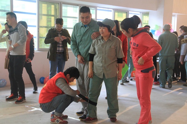 緊接著第二個(gè)團(tuán)隊(duì)游戲男女搭配的最佳拍檔游戲也要開始了:起點(diǎn)是二人三足,折返點(diǎn)是背對(duì)背夾氣球返回起點(diǎn)。哨聲一響,二人三足這邊有的隊(duì)員配合得好兩人跑步到了折返點(diǎn);但有的隊(duì)員因?yàn)楣?jié)奏不協(xié)調(diào),慢吞吞地走著,落后了一大截;有的隊(duì)員的氣球掉落地上、有的隊(duì)員用力不當(dāng),氣球爆了,只能回到折返點(diǎn)重新再來(lái)。