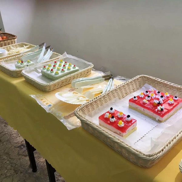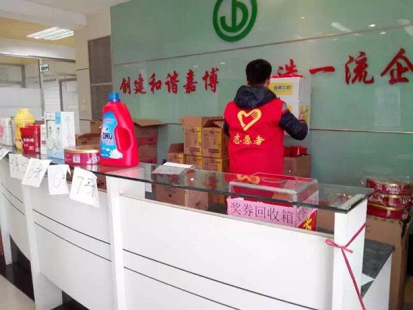 1月31日,廠區(qū)綠化樹上、活動(dòng)現(xiàn)場(chǎng)到處都掛滿了紅燈籠、五顏六色的彩旗和氣球,洋溢著濃濃的節(jié)日喜慶氣氛。辦公樓前臺(tái)臨時(shí)被布置為兌獎(jiǎng)處,獎(jiǎng)品琳瑯滿目,油、米、洗發(fā)水、糖果、餅干等各式年貨用品一應(yīng)俱全。研發(fā)中心一樓大堂的茶歇處已為員工們準(zhǔn)備了各式茶點(diǎn):精美的蛋糕、香脆的餅干、新鮮的水果、可口的酸奶等。志愿者們各就各位,隨時(shí)為員工提供優(yōu)質(zhì)服務(wù)。